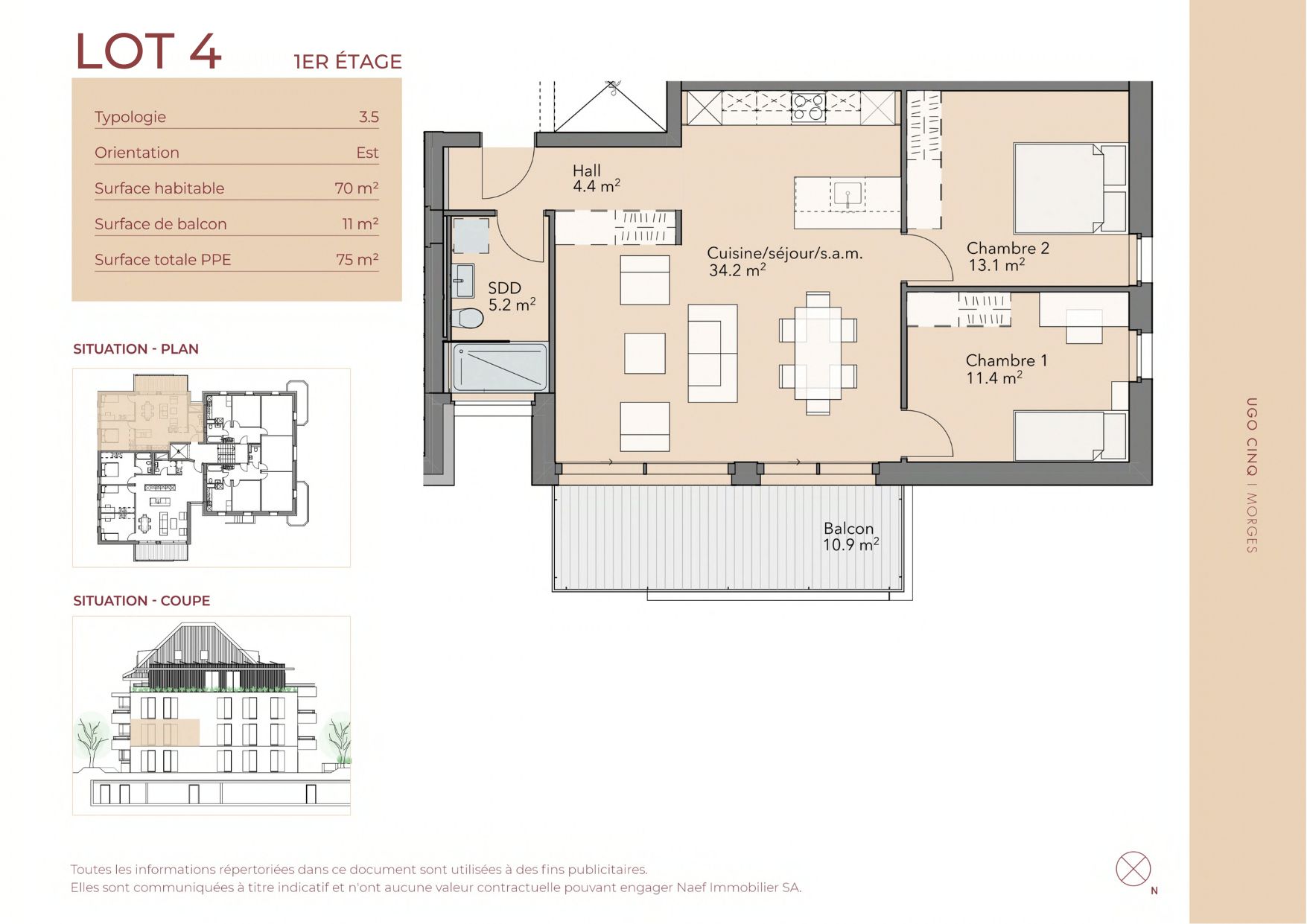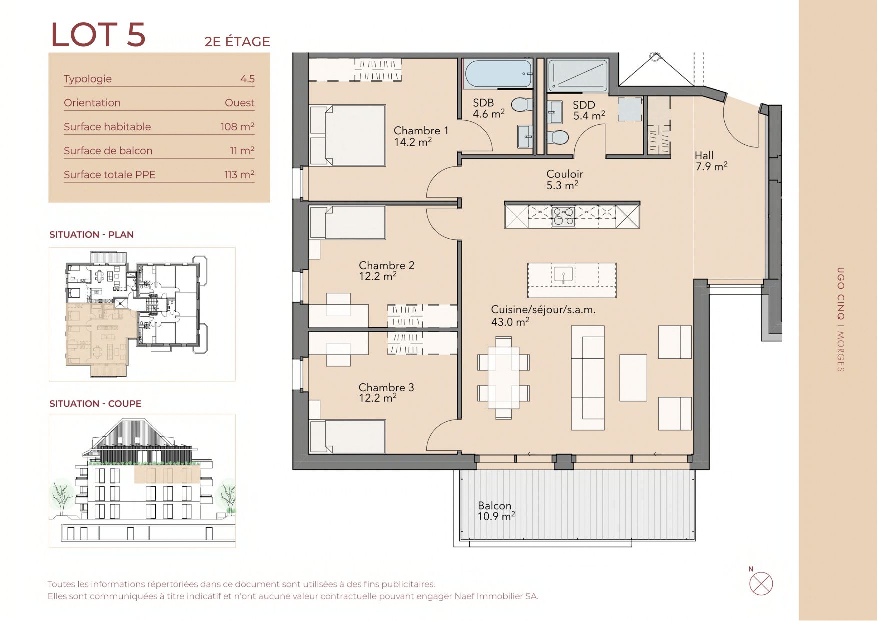 Les 7 logements du projet UGO Cinq s’intègrent dans l’extension de l’immeuble existant. Cette nouvelle construction propose des appartements de 3.5 et 4.5 pièces, avec des surfaces pondérées allant de 75 à 113 m², répartis sur 4 étages desservis par un ascenseur.